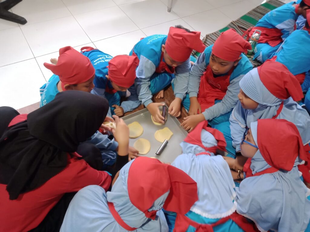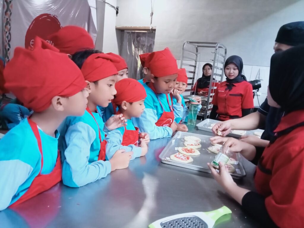 Peserta didik mengikuti kegiatan cooking class (membuat pizza) dengan dipandu team Elmara Cake. Hasil pizza yang telah dibuat dapat mereka nikmati.